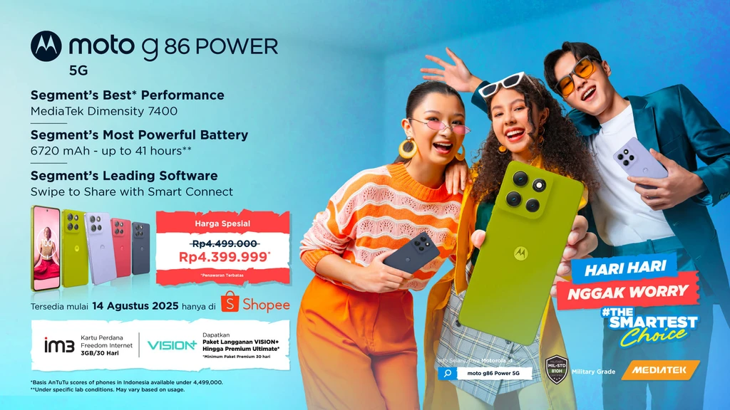 Dengan harga hanya Rp3.999.000, moto g86 Power 5G diklaim sebagai #TheSmartestChoice berkat kombinasi performa tangguh, baterai besar, layar berkualitas tinggi, hingga fitur-fitur AI canggih.